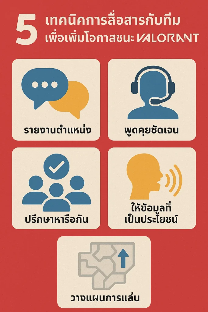 การสื่อสารคือหัวใจของชัยชนะใน Valorant ไม่ว่าคุณจะเป็นมือใหม่หรือผู้เล่นระดับสูง การฝึก พูดสั้น ๆ ชัดเจน, รายงานสถานะ, ให้ข้อมูลแม้หลังตาย, ใช้ Ping และรักษาน้ำเสียงเชิงบวก จะทำให้ทีมแข็งแกร่งและโอกาสชนะสูงขึ้น